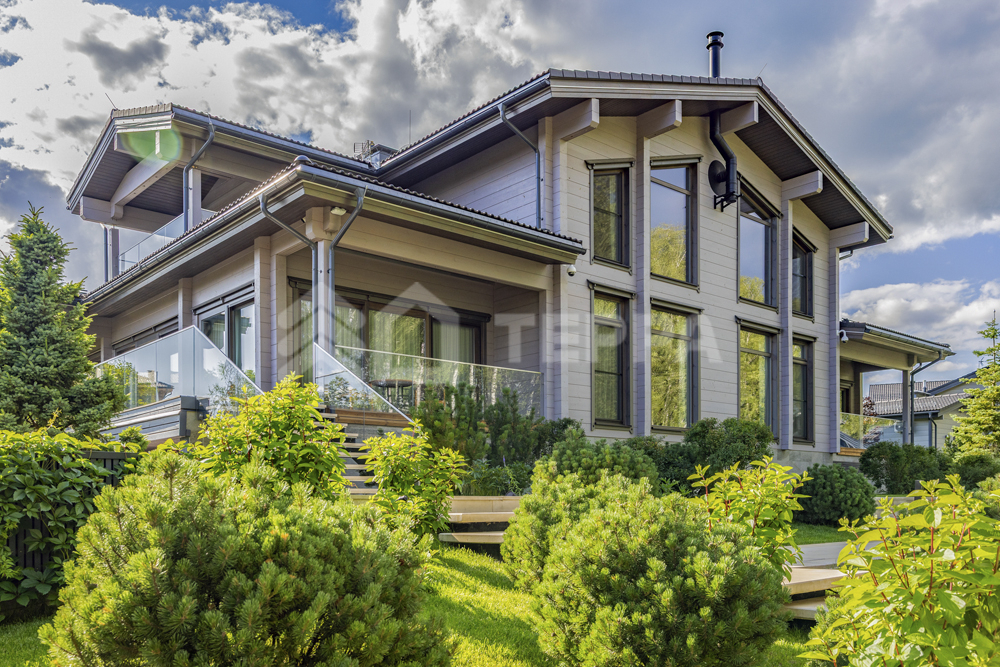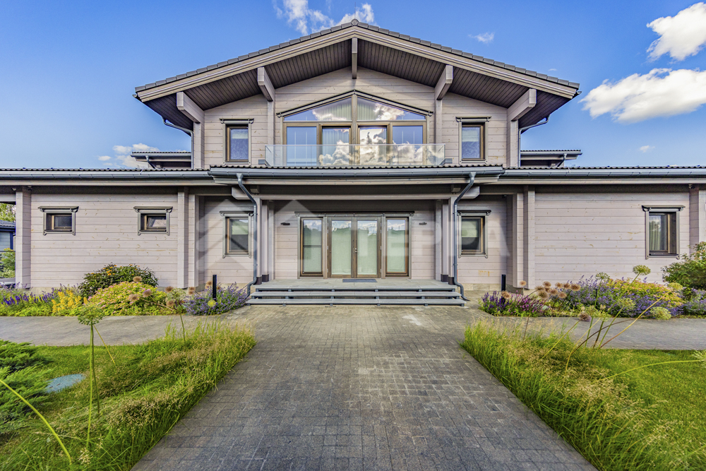 Коттедж площадью 730 кв.м. расположен на участке 25 соток, окруженный живописным лесом. Его фасад в современном стиле с элементами шале облицован камнем и деревом благородного серого оттенка. Крупные панорамные окна с тонкими переплетами подчеркивают симметрию строения, а массивные наклонные карнизы придают ему скандинавский характер. Каменное основание создает ощущение прочности, а утонченные вертикальные детали добавляют динамики.