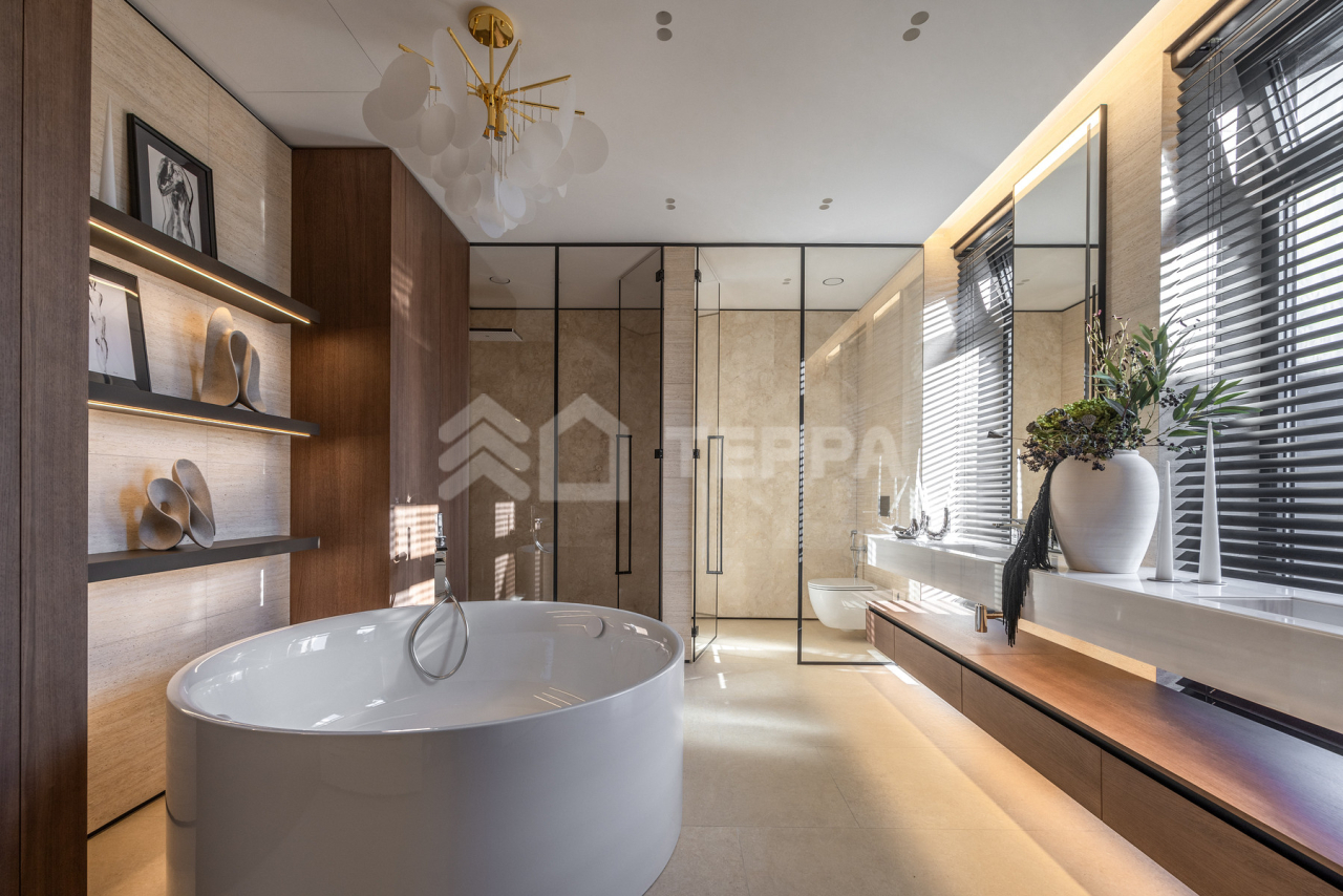 Просторная терраса, собственный бассейн и SPA-зона, понорамные окна и высокие потолки, отдельная квартира для персонала обеспечивает максимальный комфорт проживания.