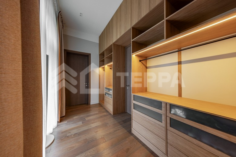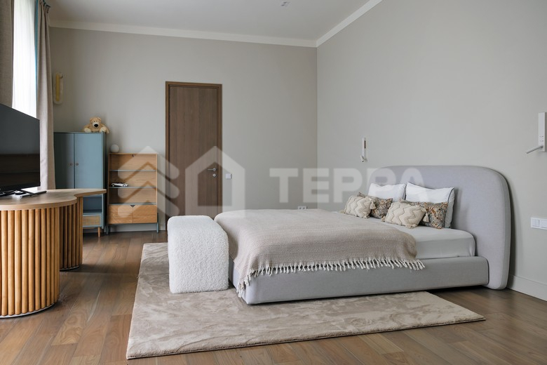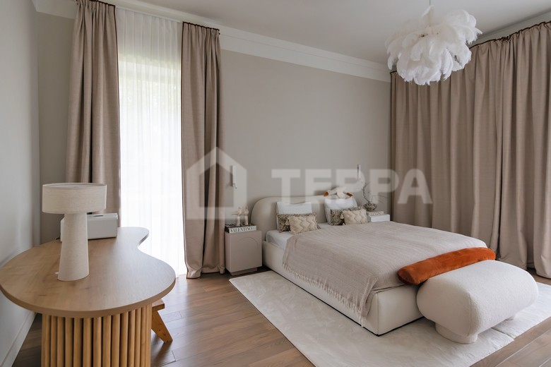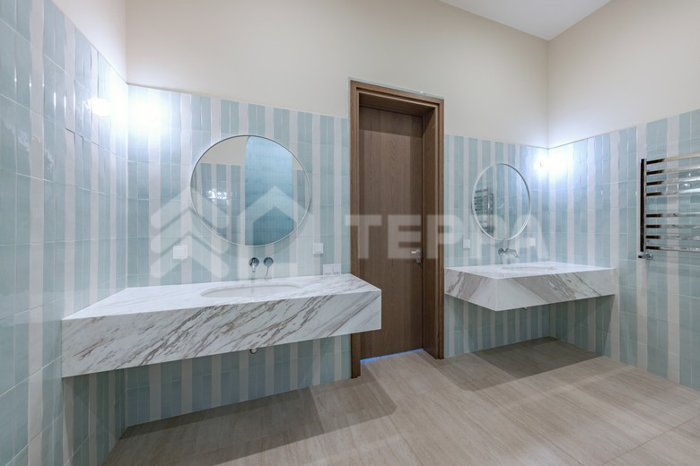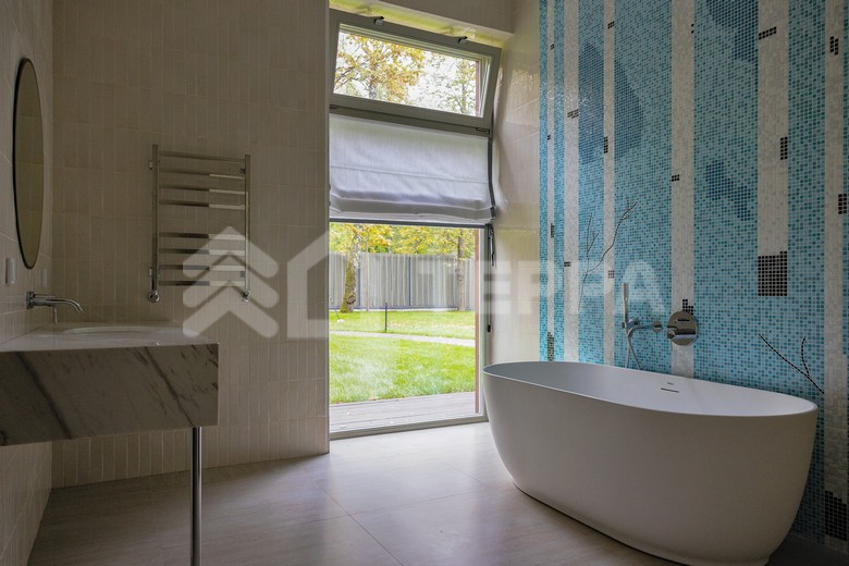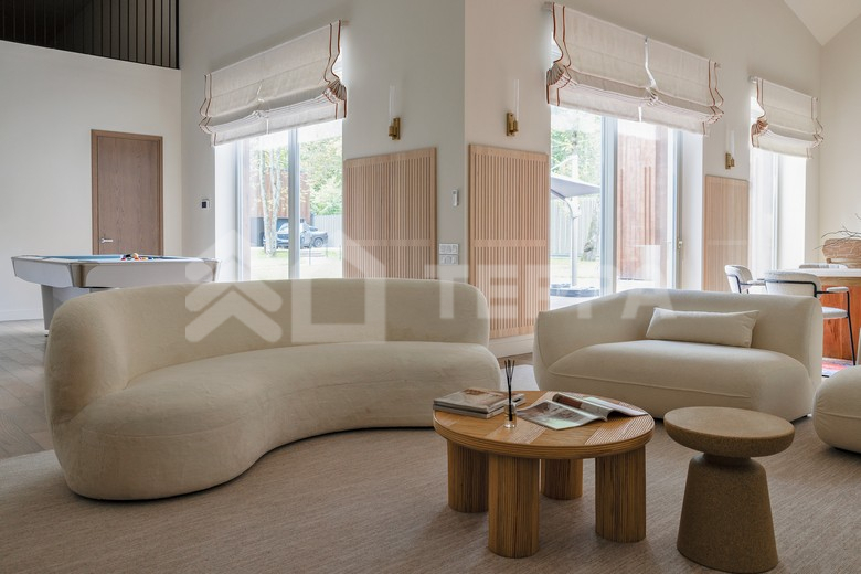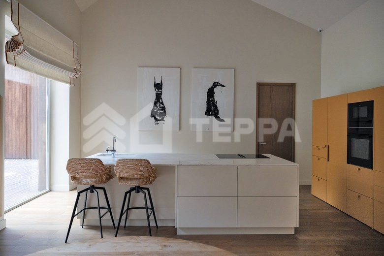 Технологичность не уступает эстетике: приточно-вытяжная вентиляция, кондиционирование, повышенное давление воды, водоочистка, электроприводы штор, датчики протечек, видеонаблюдение, закладные под бассейн на участке, мощность 25 кВт электричества.
