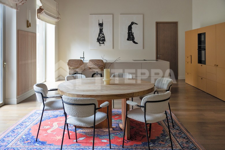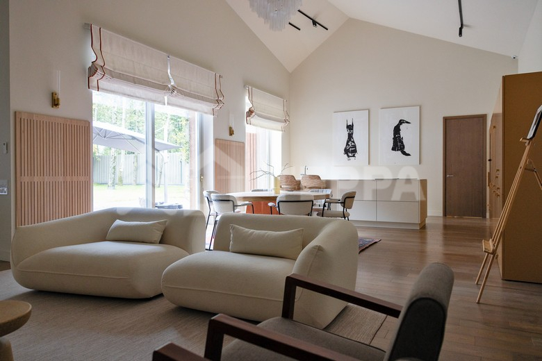 Интерьер выполнен в скандинавском стиле с элементами рустика и contemporary: светлые пространства, натуральные материалы, фактурные акценты и воздушность создают гармонию уюта и масштаба.
