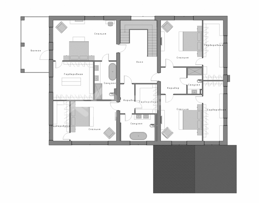 - мастер-спальня с ванной комнатой гардеробной и выходом на балкон