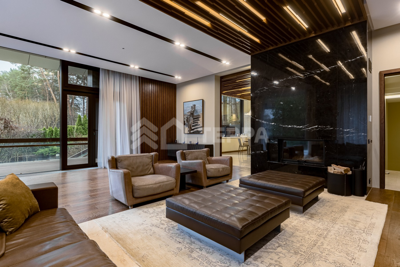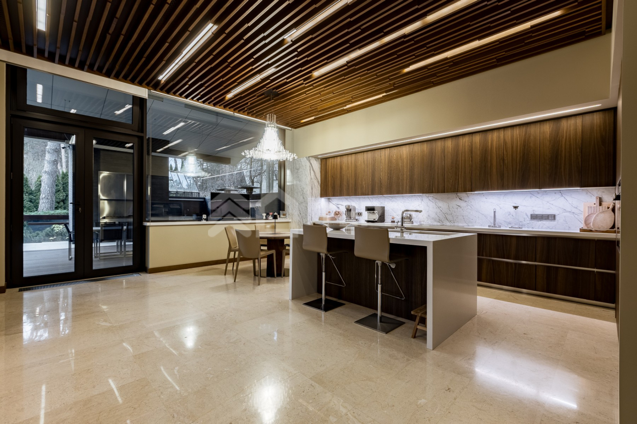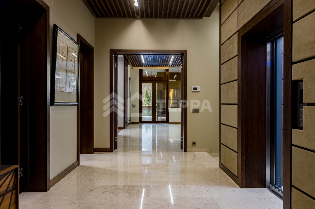 Особенность дома: просторные помещения с продуманным функционалом, включая собственный лифт, элегантный кабинет, четыре спальни с отдельными санузлами, двухкомнатную квартиру специально обустроенную для проживания обслуживающего персонала, гараж на два автомобиля, благоустроенную парковочную зону, просторную террасу с барбекю. Участок площадью 20 соток с профессионально разработанным ландшафтным дизайном.