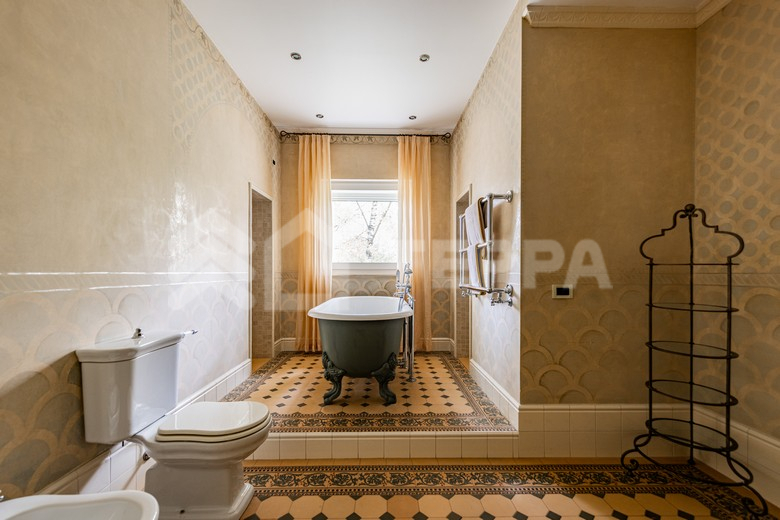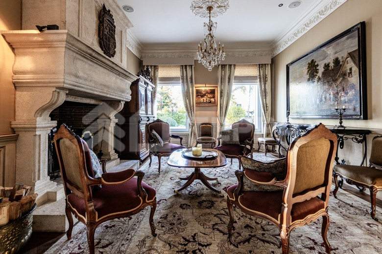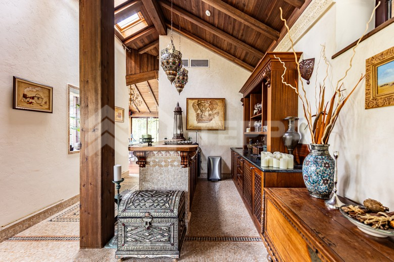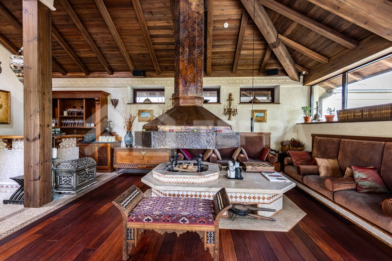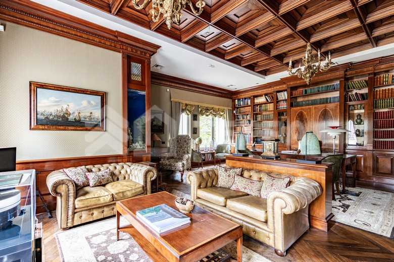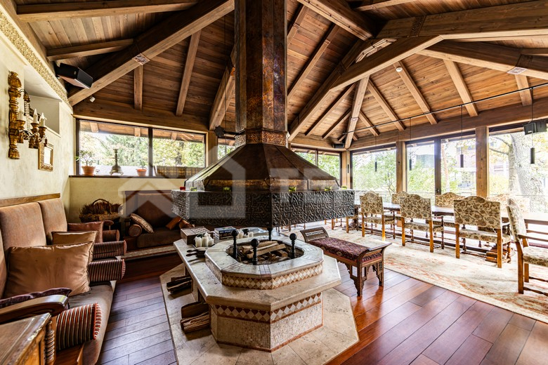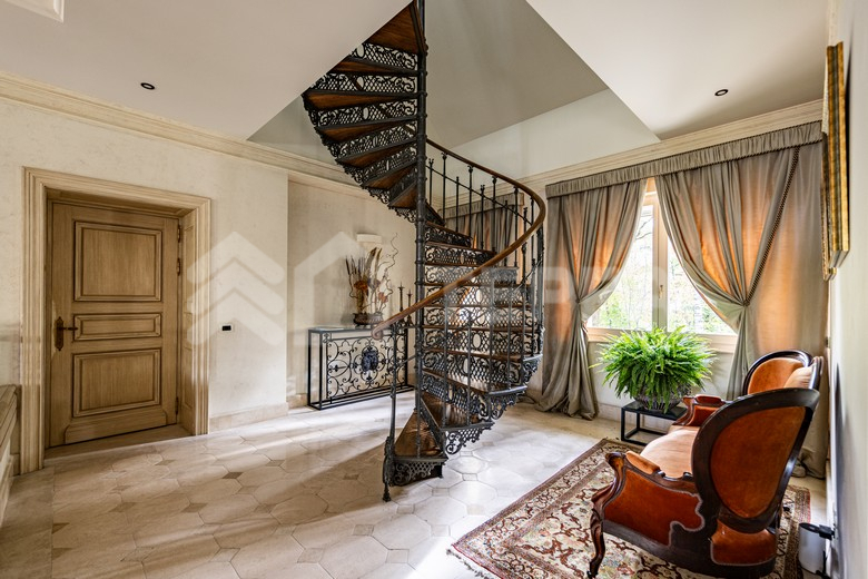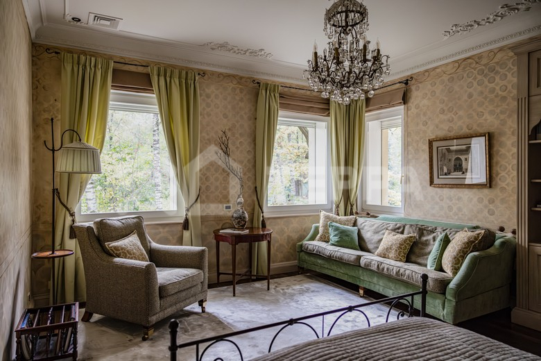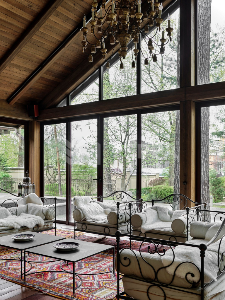 На первом этаже основного дома, общей площадью 784 м2 общественные зоны плавно перетекают друг в друга. Второй этаж предлагает уединение в трех спальнях с индивидуальными гардеробными и санузлами, а цокольный уровень открывает мир релаксации с бассейном, SPA-комплексом и кинозалом. Мансарда с просторной детской зоной завершает эту совершенную композицию. Интерьеры, созданные под руководством архитектора Екатерины Григорьевой, несут в себе философию Джона Саладино. Основой концепции стала его философия «хода времени», воплощенная в интерьере через включение антикварных предметов и искусства, которые, подобно живой ткани, связывают прошлое с настоящим.