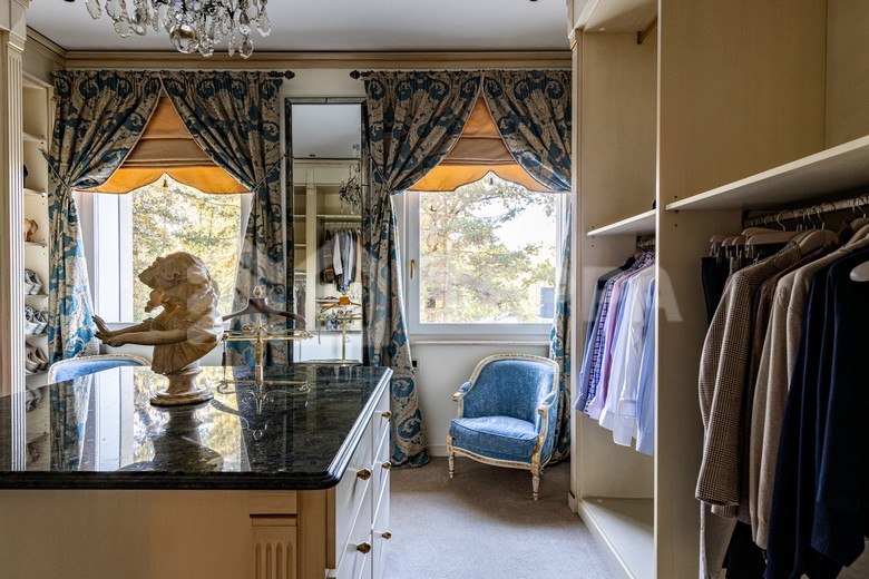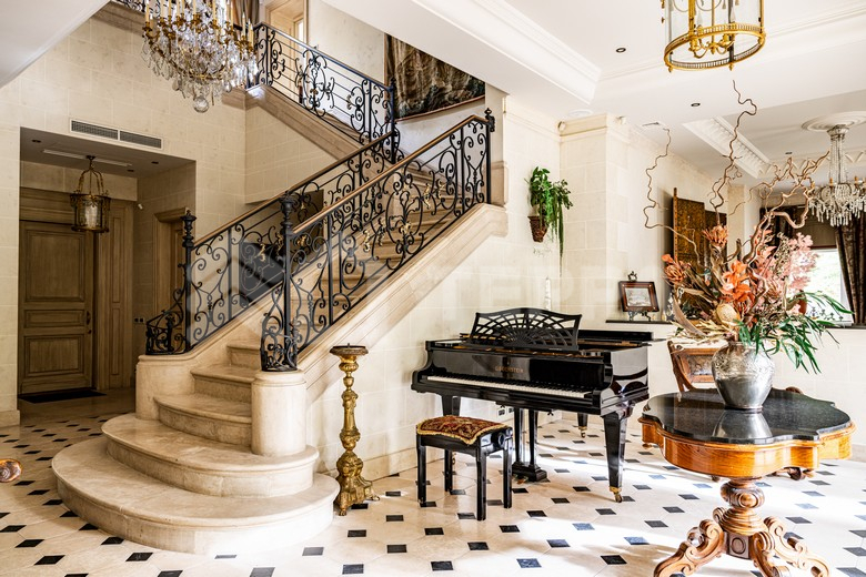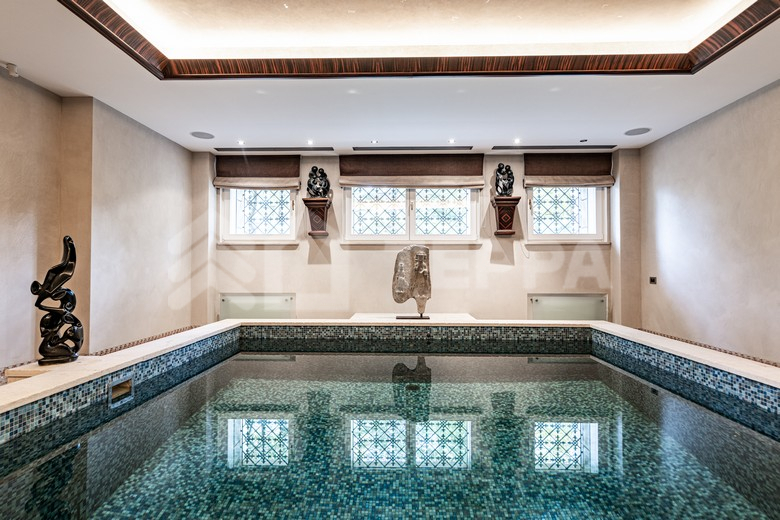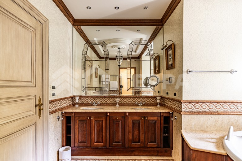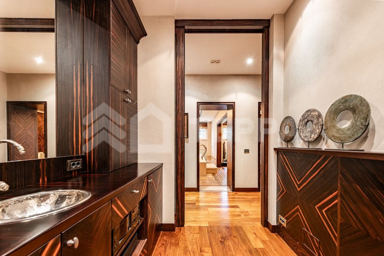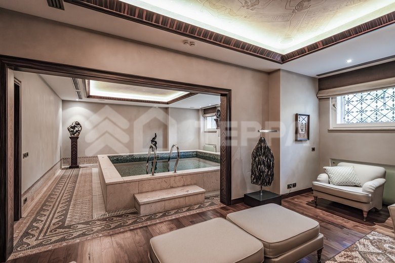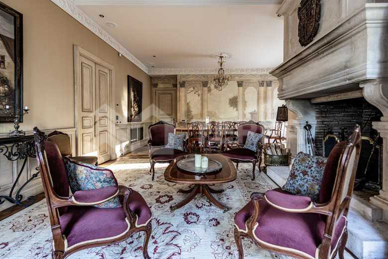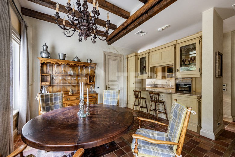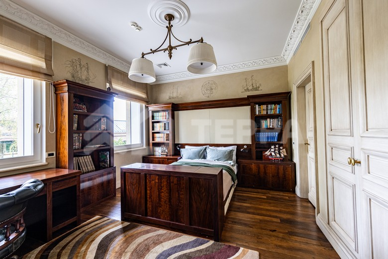 На первом этаже основного дома, общей площадью 784 м2 общественные зоны плавно перетекают друг в друга. Второй этаж предлагает уединение в трех спальнях с индивидуальными гардеробными и санузлами, а цокольный уровень открывает мир релаксации с бассейном, SPA-комплексом и кинозалом. Мансарда с просторной детской зоной завершает эту совершенную композицию. Интерьеры, созданные под руководством архитектора Екатерины Григорьевой, несут в себе философию Джона Саладино. Основой концепции стала его философия «хода времени», воплощенная в интерьере через включение антикварных предметов и искусства, которые, подобно живой ткани, связывают прошлое с настоящим.