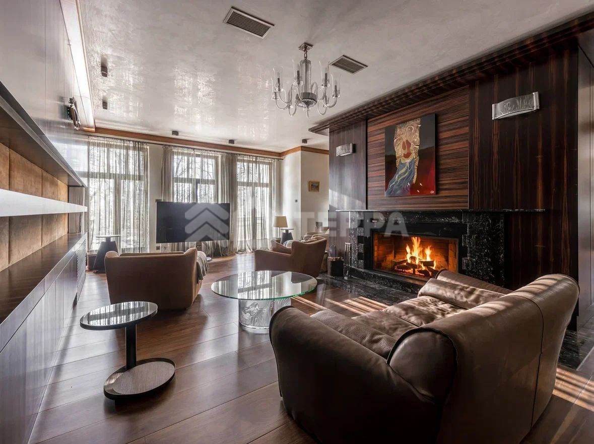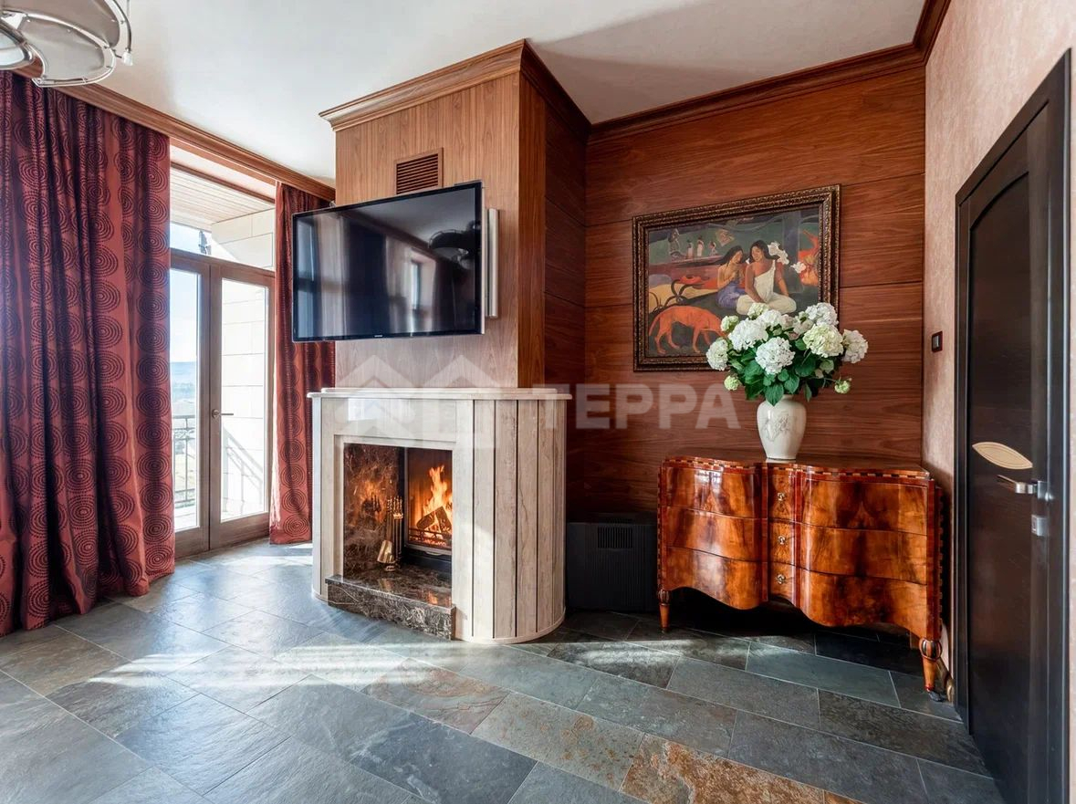 - гостиная с камином и выходом на террасу